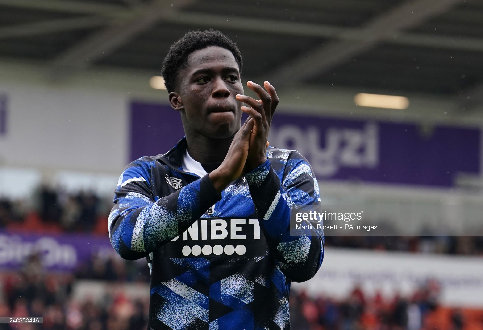 Derby County's Malcolm Ebiowei applauds the fans after the Sky Bet Championship match at Bloomfield Road, Blackpool. Picture date: Saturday April 30, 2022. (Photo by Martin Rickett/PA Images via Getty Images)