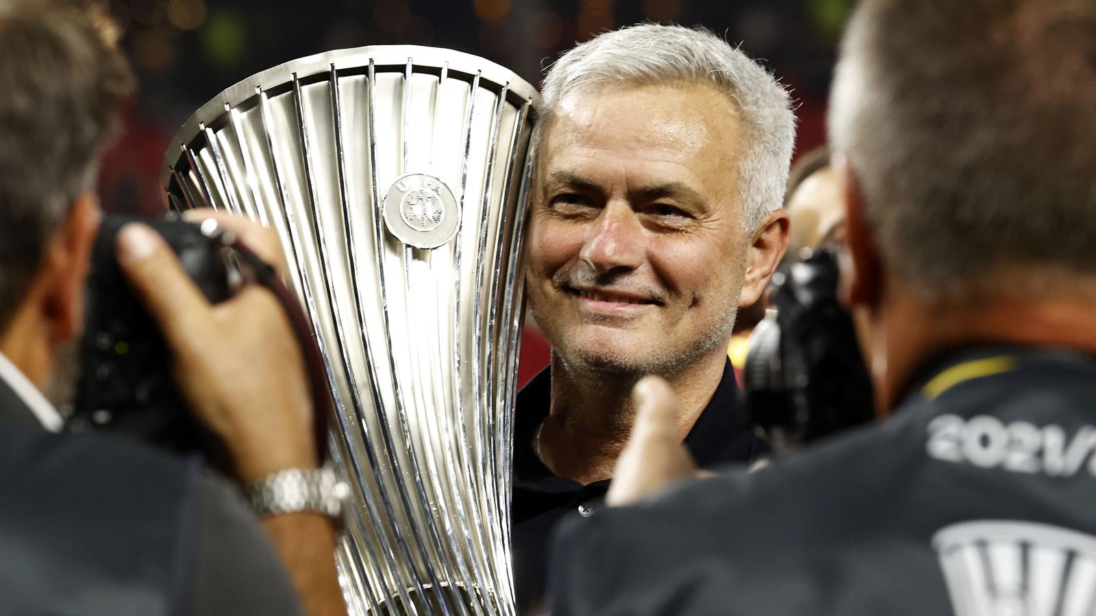 2J9XJYH TIRANA - AS Roma coach Jose Mourinho with Conference League trophy, Conference League cup, Conference League cup during the UEFA Conference League final match between AS Roma and Feyenoord at Arena Kombetare on May 25, 2022 in Tirana, Albania. ANP MAURICE VAN STEEN