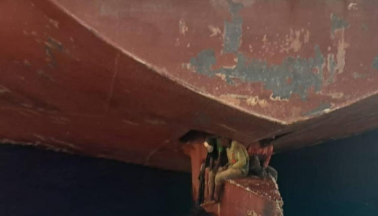 The maritime rescue agency, known in Spain as Salvamento Marítimo. shared a photo of the three men sitting on top of the rudder under the ship’s massive hull with their feet hanging only a few centimeters (inches) from the water.
