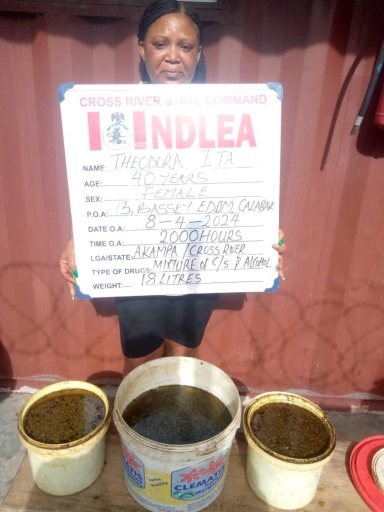 “In Cross River State, a 40-year-old widow and mother of two, Mrs. Theodora Ita was on Monday 8th April arrested at Bassey Edom, Calabar, by NDLEA operatives for producing and selling a lethal new psychoactive substance, NPS, locally called ‘Combine’, which is a mixture of different strains of cannabis and opioids soaked in raw gin.