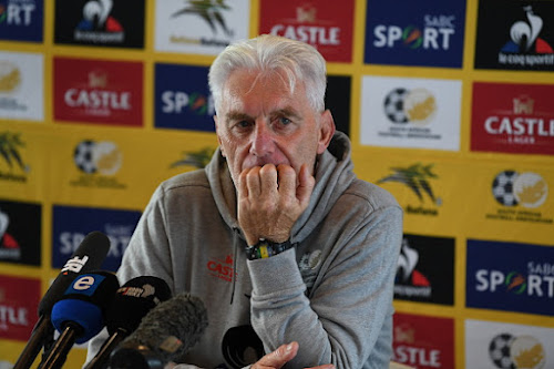 JOHANNESBURG, SOUTH AFRICA - NOVEMBER 08: Head coach Hugo Broos during the South African national soccer team press conference at Dobsonville Stadium on November 08, 2021 in Johannesburg, South Africa. (Photo by Lefty Shivambu/Gallo Images/Getty Images)
