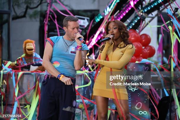 Chris Martin of Coldplay and Ayra Starr perform on NBC's "Today" at Rockefeller Plaza on October 08, 2024 in New York City. Photo by Marleen Moise