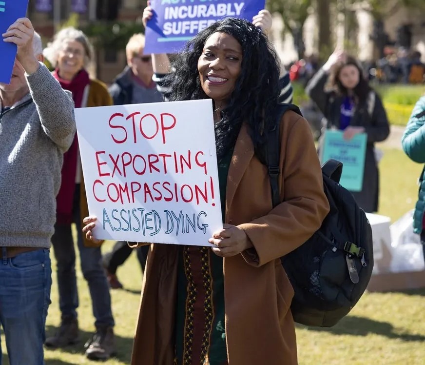 Some carried placards with slogans like “kill the bill, not the ill,” and “first, do no harm,” while others held banners saying “let us choose” and calling for “dignity in death.”