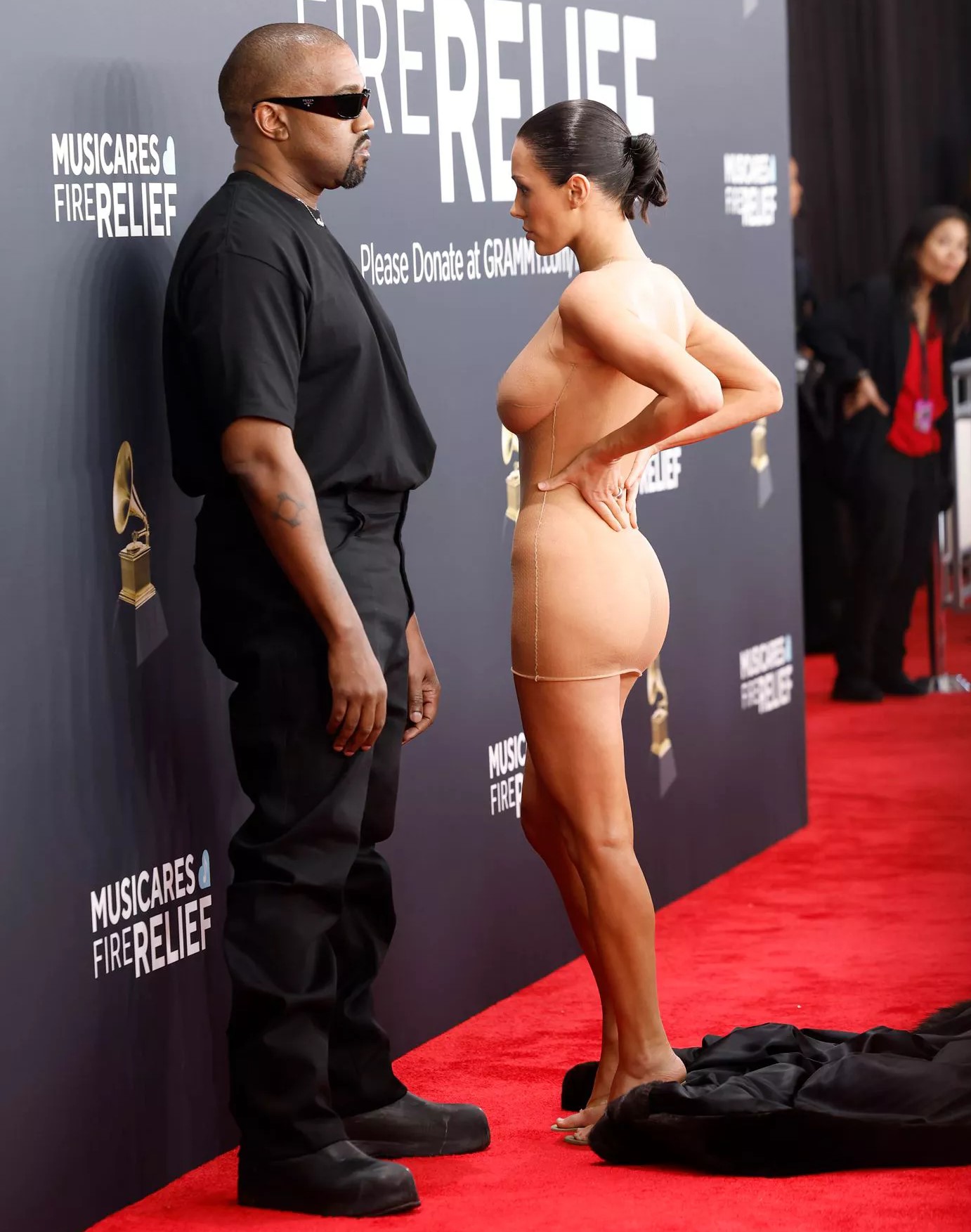 West and his wife made a spectacle at the red carpet when his wife took off her fur coat to reveal a see-through dress, which displayed all her tools of enchantment. West did not stay for the duration of the event, he later denied reports that he was escorted out.