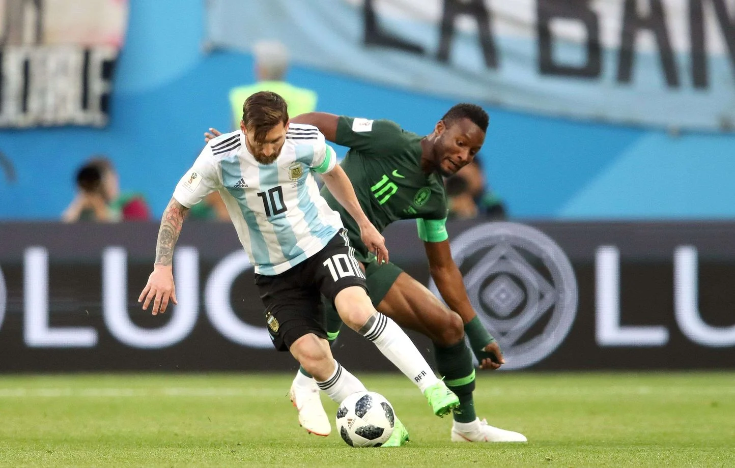 Mikel and Messi tango in the 2018 World Cup.