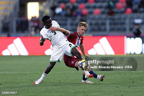 Odinaka Okoro of Nigeria and Lars Remmem of Norway battle for the ball during the FIFA U-20 World Cup Chile 2025 Group F match between Norway and Nigeria at Estadio Fiscal on September 29, 2025 in Talca.