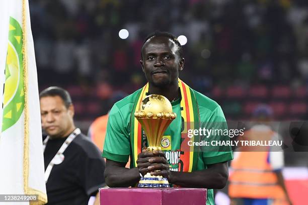 Senegal's forward Sadio Mane the trophy ceremony after winning after the Africa Cup of Nations 2021 final.